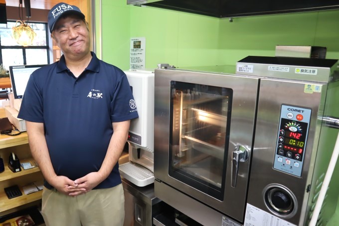 「コメットさんの製品で驚いたのはローレンジの火力です。今まで使っていたものよりかなり強いので、加熱時間が半分になりました。また、スチコンは焼き魚や鶏チャーシューを作ったり、温泉卵なども簡単にかつ大量に作れて便利です。名産のピーナッツを煎る作業もスチコンで行い、涼しく楽に作業できています。他にも、コロッケなど揚げ物を今後スチコンで作れたらと考えています!」とお話いただいたのは隣接された草刈房の駅駅長の萱嶋様。