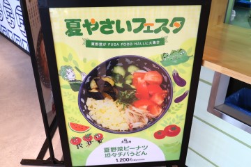 「FUSA FOODHALLは千葉最大級のフードコートです!千葉観光の際にはぜひ寄ってみてください。100種類以上の豊富なメニューを取り揃えて、お待ちしております」と魅力を語る。新メニューを日々開発して、2か月に1回期間限定のフェアを開催。取材日には“夏野菜フェスタ”を開催しており、夏にピッタリな冷やしメニューが美味しそう。新メニューは店舗スタッフも考案し、実際に店舗に並ぶことも。千葉ならではの食材を使用した豊富なラインナップで毎日来ても飽きないだろう。