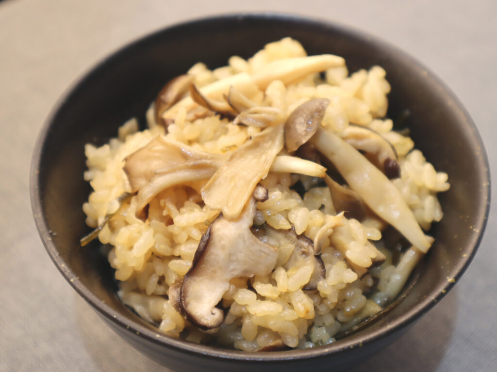 - きのこの水分が多いため、軟飯になるのを防ぐために、通常の炊き込みご飯の加水量よりも減らしています。