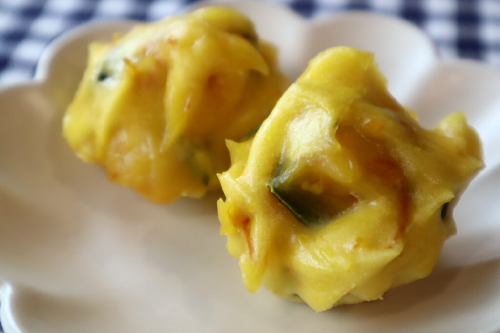 - かぼちゃを1cm角に切り、C)を絡めます。